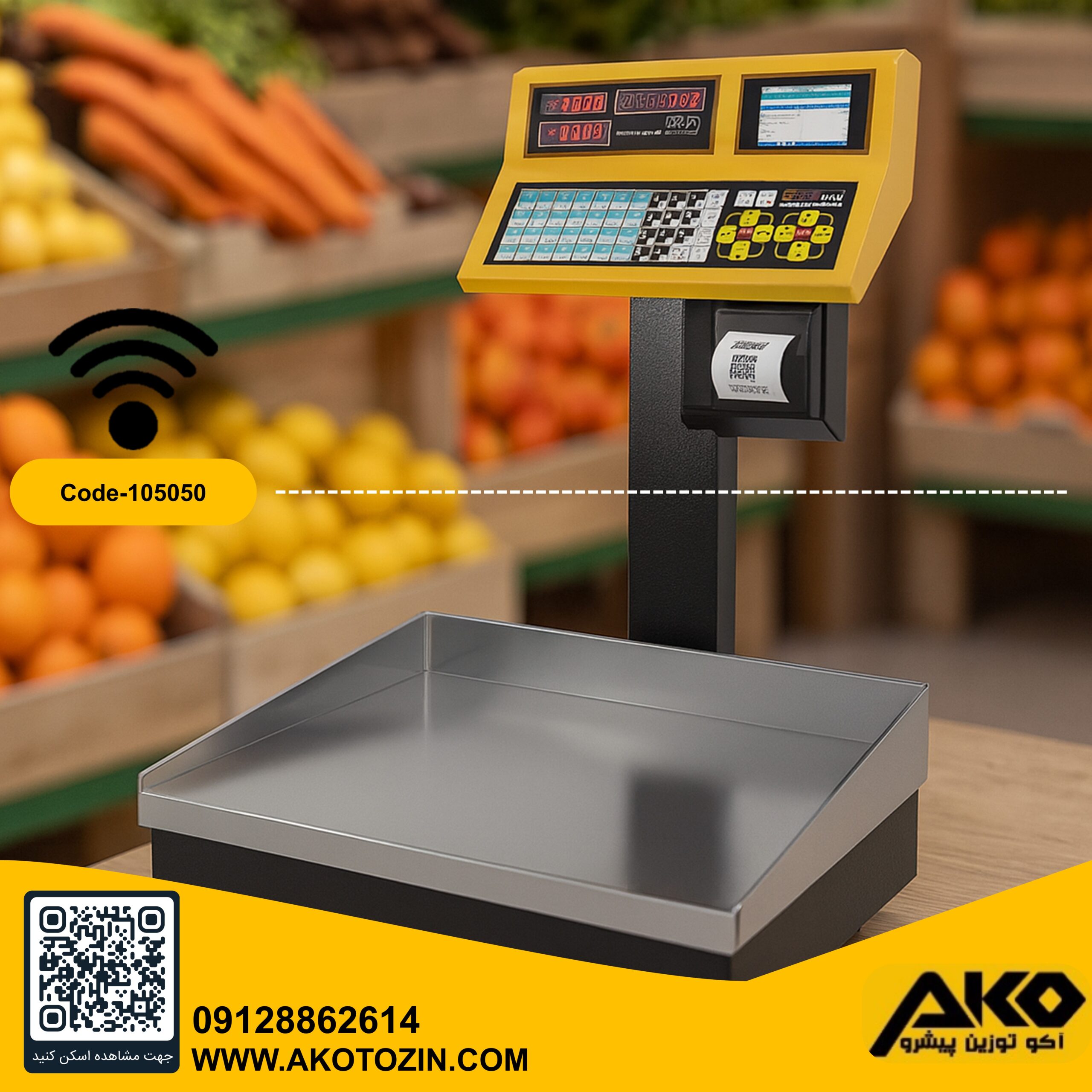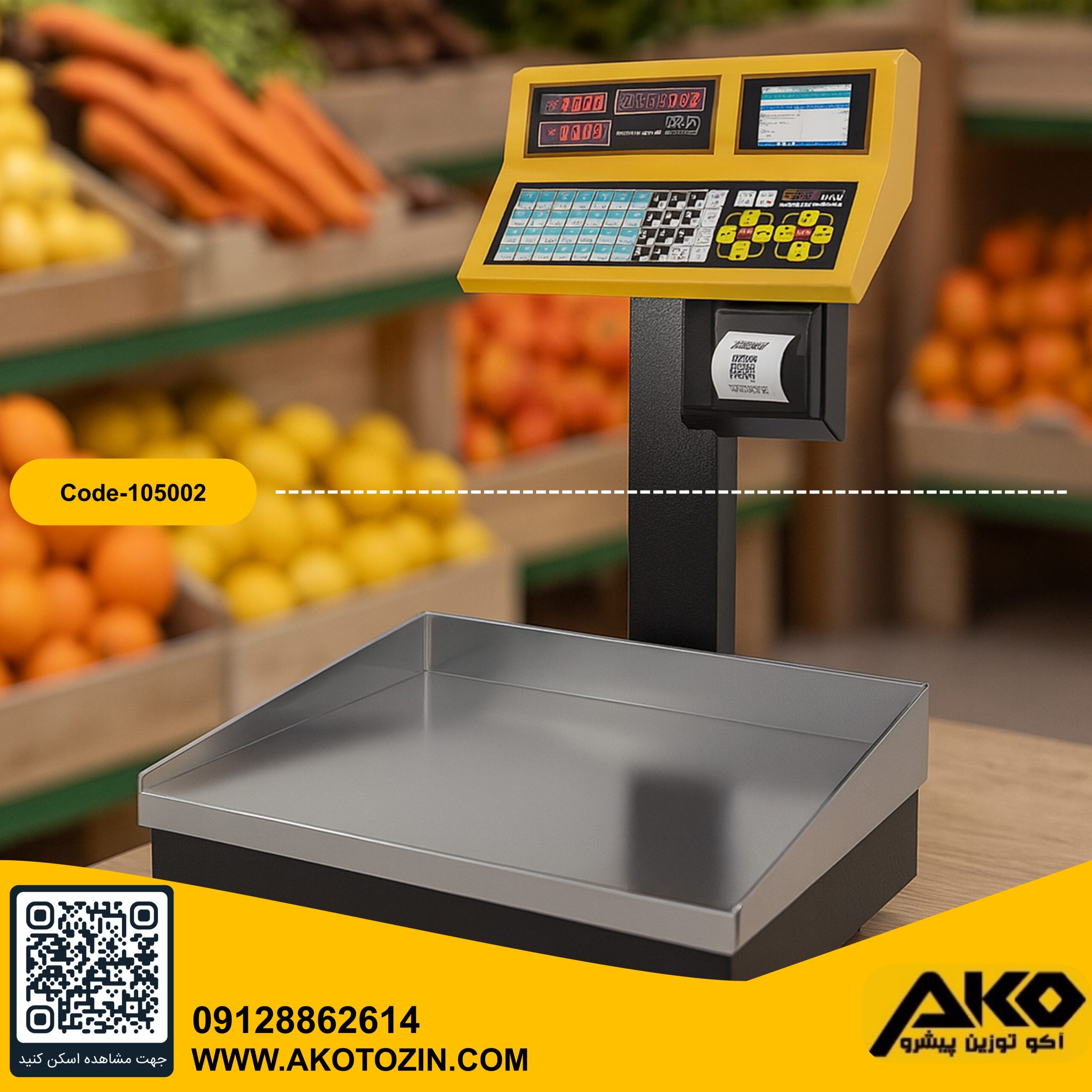 مزایا (نمونه ویژگیها): نمایشگر ۱۵ اینچ + نمایشگر مشتری ~۹ اینچ (بسته به مدل)، سیستمعامل ویندوز، رم ۴GB، پورتهای USB/LAN/Serial، ظرفیت ۳۰ کیلو با دقت ۲–۱۰ گرم.